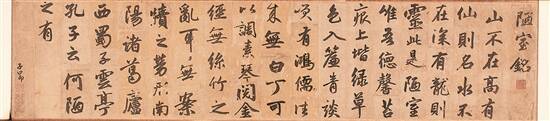 本次展览展出的赵孟頫行书《陋室铭》卷,原为纸本挂轴,后来经蓑衣裱(朱万章解:将作品的画心裁条改装再行装裱,这种手法叫蓑衣裱,也叫缩衣裱),改为纵49厘米、横131厘米的手卷,作者署穷款“子昂”,钤朱文方印“赵氏子昂”,引首钤朱文长方印“松雪斋”。