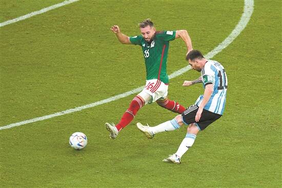 梅西(右)打入远射进球 新华社发