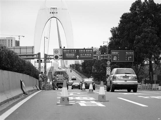 11月30日下午,广州,工作人员正在拆除猎德大桥附近围蔽的水马 羊城晚报记者 邓勃 摄