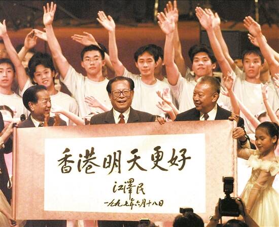 1997年7月1日上午10时,中华人民共和国香港特别行政区成立庆典在香港会展中心新翼举行。在庆典仪式上展示了江泽民同志亲手题写的“香港明天更好”书法卷轴