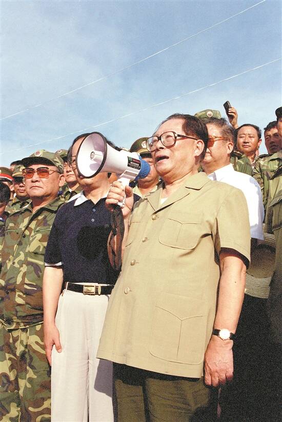 1998年8月13日至14日,江泽民同志亲赴湖北长江抗洪抢险第一线,看望、慰问、鼓励奋战在抗洪抢险第一线的广大军民,指导抗洪抢险斗争。这是8月13日江泽民同志在洪湖市乌林镇中沙角险段大堤上,向正在抗洪抢险的军民发表讲话