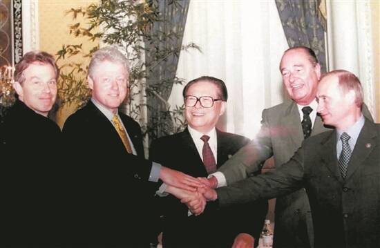 2000年9月7日,由中国倡议的联合国安理会五个常任理事国首脑会议在纽约举行。江泽民同志(中)同法国总统希拉克(右二)、俄罗斯总统普京(右一)、英国首相布莱尔(左一)、美国总统克林顿(左二)握手合影