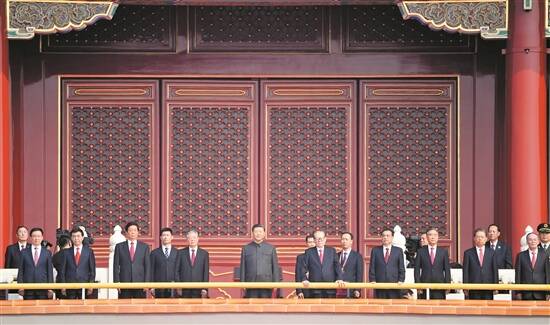 2019年10月1日,庆祝中华人民共和国成立70周年大会在北京天安门广场隆重举行。这是习近平同志、江泽民同志、胡锦涛同志等在天安门城楼上