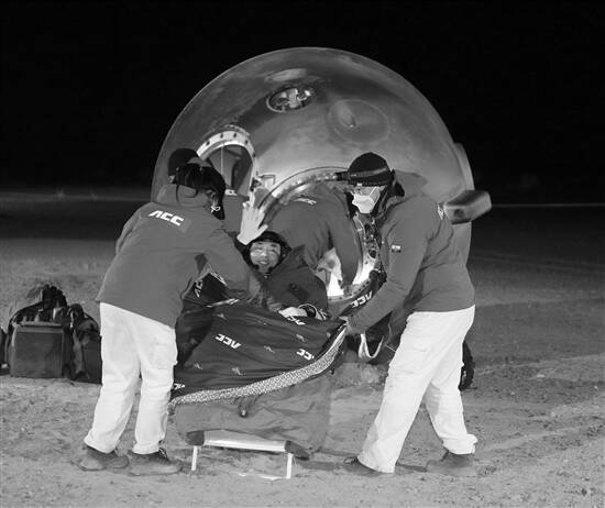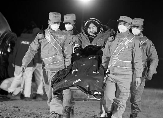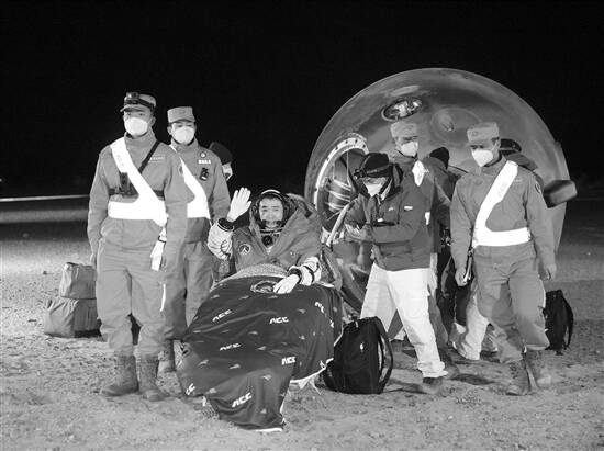 据新华社电 12月4日20时09分,神舟十四号载人飞船返回舱在东风着陆场成功着陆,现场医监医保人员确认航天员陈冬、刘洋、蔡旭哲身体状态良好(见上图,新华社发),神舟十四号载人飞行任务取得圆满成功。