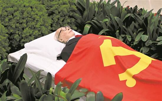 12月5日,江泽民同志的遗体安卧在鲜花翠柏丛中,身上覆盖着鲜红的中国共产党党旗 新华社发