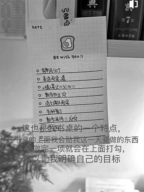 学生在书桌上贴上自己的每日日程,明确自己的学习目标