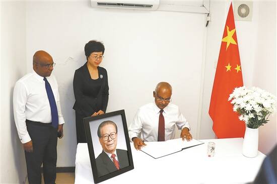 12月5日,马尔代夫总统萨利赫(右)在中国驻马尔代夫大使馆吊唁江泽民同志