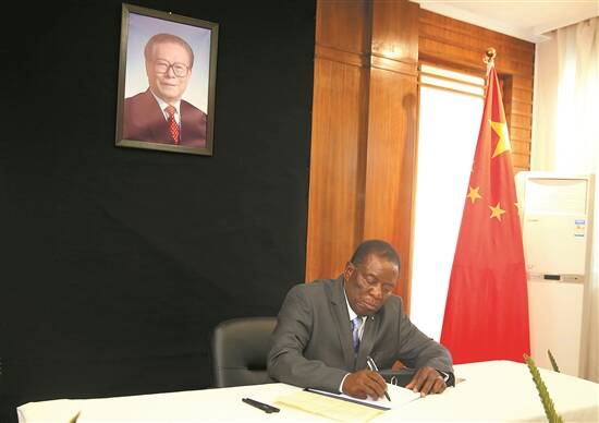12月5日,津巴布韦总统姆南加古瓦在中国驻津巴布韦大使馆吊唁江泽民同志