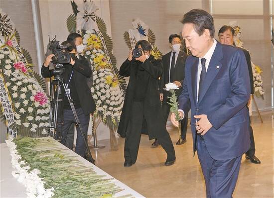 12月2日,韩国总统尹锡悦在中国驻韩国大使馆吊唁江泽民同志