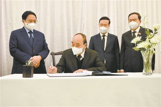 12月2日,越南国家主席阮春福(左二)、总理范明政(左一)等在中国驻越南大使馆吊唁江泽民同志