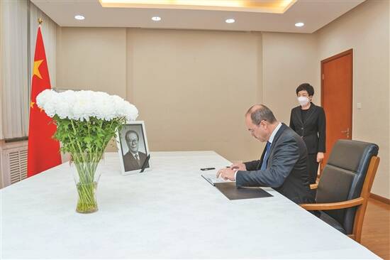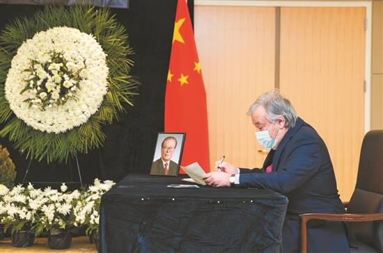 12月5日,联合国秘书长古特雷斯在中国常驻联合国代表团驻地吊唁江泽民同志