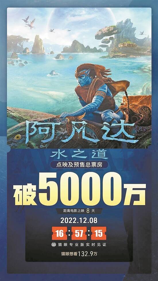 詹姆斯·卡梅隆执导的年度科幻大片《阿凡达:水之道》(以下简称《阿凡达2》)将于12月16日登陆中国内地大银幕。7日,影片开启预售。灯塔专业版数据显示,该片官宣预售开启4小时,预售总票房破500万;6小时左右,这个数字就突破了1000万。据猫眼专业版数据,截至8日下午,《阿凡达2》点映及预售总票房破5000万元。