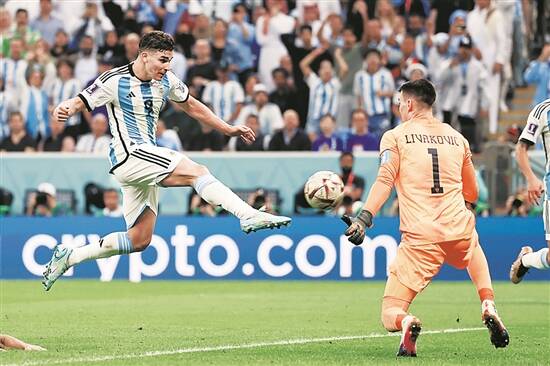 阿根廷队阿尔瓦雷斯(左)射门得分 新华社发