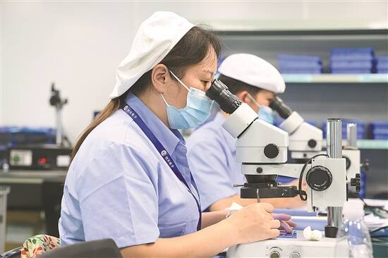 专精特新“小巨人”企业创天电子的科研人员,正在开展半导体元器件产品研发工作
