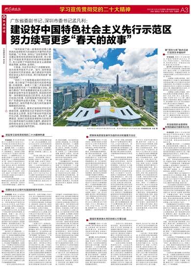 “党的二十大报告提出我们党的中心任务,充分彰显了中国式现代化的宏伟蓝图、壮阔前景。省委十三届二次全会确定我省当前和今后一个时期的奋斗目标,即奋力推动广东在全面建设社会主义现代化国家新征程中走在全国前列、创造新的辉煌!深圳要担负起自己的责任,扎扎实实办好自己的事,为积极探索中国式现代化的广东路径作出更大贡献。”日前,广东省委副书记、深圳市委书记孟凡利在接受羊城晚报采访时说。