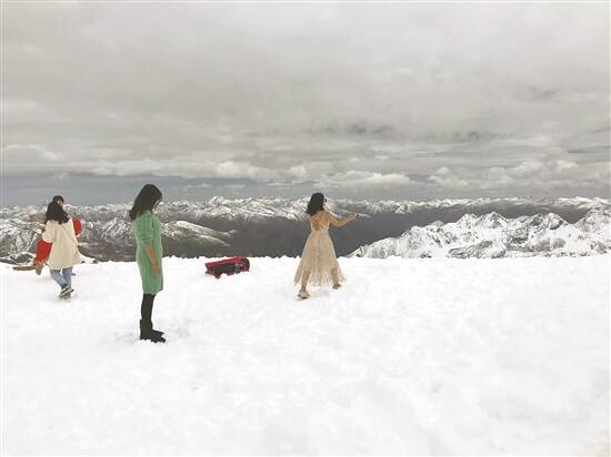 雪路两边是块相对宽敞的山顶雪坪,接踵而至的游人男女在缺氧感尚未到来之前,有的面对绵延无涯的冰天雪地,禁不住舞拳呼喊;有的脱去御寒的羽绒服露出肌肉隆起的肩背,以显示对于寒冷的蔑视,挑战着自我;更有拍摄婚纱照的俊男倩女,提起拖雪的长裙,奋力奔跑,留下人生最为难忘的一瞬。