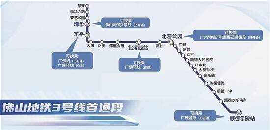 3号线首通段开通后,将把佛山更多重点片区纳入地铁辐射范围,与广佛线、2号线一期、广州地铁7号线西延顺德段初步形成佛山轨道交通的骨干线网。其中,3号线首通段可在湾华站与佛山地铁2号线实现换乘,在北滘公园站与广州地铁7号线西延顺德段实现换乘,在东平站与广佛线实现换乘。