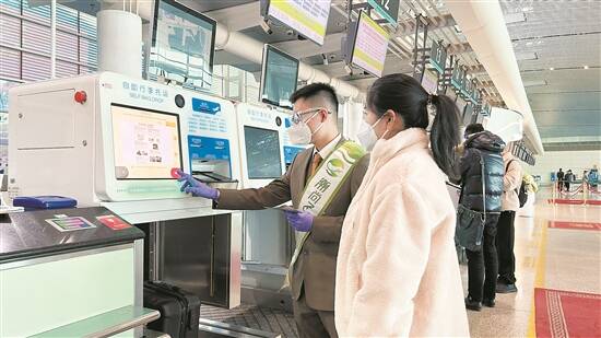 机场工作人员正为旅客办理行李托运 通讯员供图