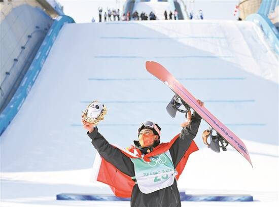 苏翊鸣在北京2022年冬奥会单板滑雪男子大跳台决赛夺冠后庆祝 新华社发