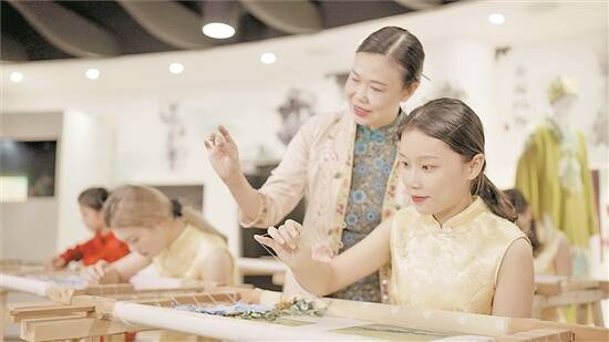 学校管理学院院长张萍介绍,学校服装设计专业早已有之,选择粤绣作为以文化人的载体,初衷是将粤绣技艺和粤绣元素用于服装设计,如今,粤绣已从专业课逐渐拓展到面向全校的公共选修课,形成粤绣文化传播传承矩阵。学生不仅仅学会了粤绣的刺绣技法,还收获了对技艺执着追求的工匠精神,收获了欣赏美、缔造美的艺术滋养。