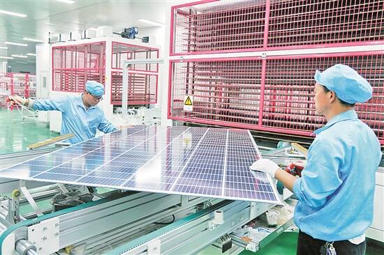 一家光伏面板生产企业车间,工人在生产线上忙碌 图/新华社发
