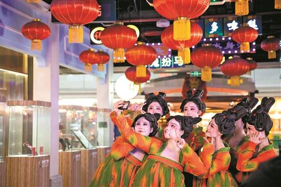 正佳广场携手联合“2021十大年度国家IP”“唐宫夜宴”,于四楼中庭打造一座大唐不夜城。