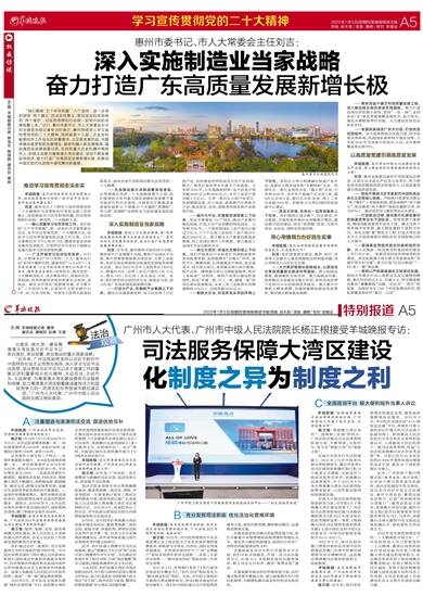 “近年来,广州法院始终坚持以习近平新时代中国特色社会主义思想为指导,深入学习习近平法治思想,坚决贯彻习近平总书记关于港澳工作的重要论述和重要指示批示精神,主动担当,主动作为,主动探索,为粤港澳大湾区建设提供司法服务和保障,助力粤港澳大湾区朝着建成富有活力和国际竞争力的一流湾区和世界级城市群加速迈进。”广州市人大代表、广州市中级人民法院院长杨正根如是说。