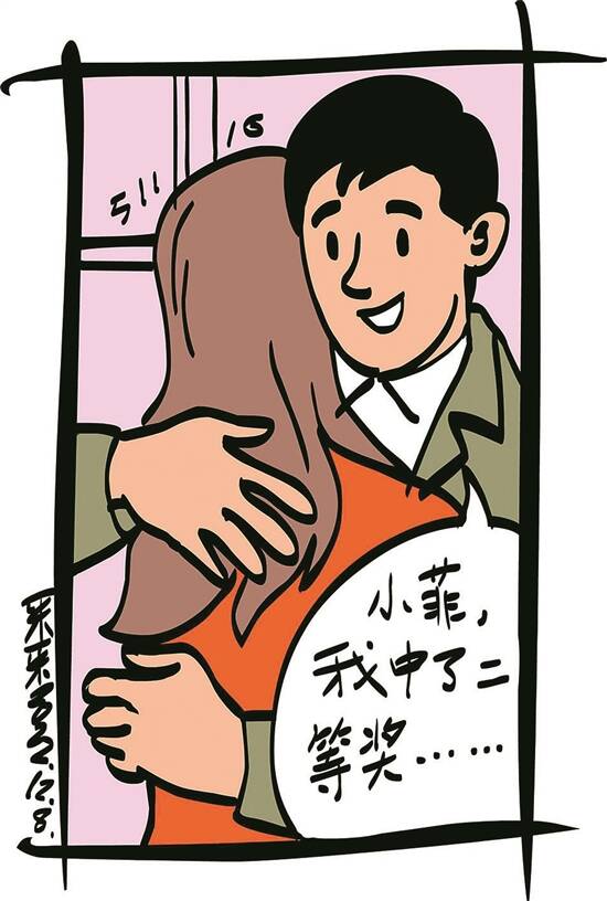 沈希文迅速跑到电视机前,紧盯滚筒里的数字,盯着盯着,沈希文一把抱住林菲,兴奋地说:“小菲,我中了二等奖,幸好我习惯5倍投注,我有钱买房子了,买了房子咱们就结婚。”
