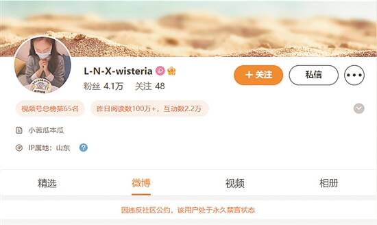 微博账号@L-N-X-wisteria显示“因违反社区公约”,被永久禁言