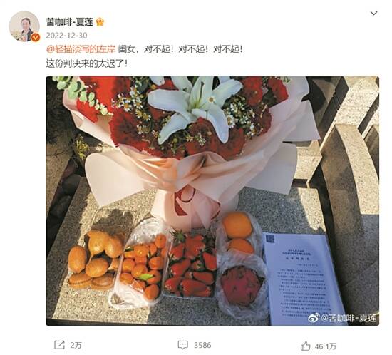 二审宣判当天,江秋莲在个人社交平台上发布了一段视频,感谢了在这2000多天里陪伴和帮助她的朋友们。随后,她郑重地将判决书和鲜花水果一同摆在女儿墓前,并和女儿说了三声“对不起”,“这份判决来得太迟了!”