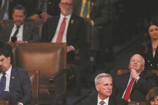 当地时间1月4日,美国华盛顿特区,美国众议院选举议长并举行第六轮投票,共和党领袖凯文·麦卡锡(前中)出席会议 视觉中国供图