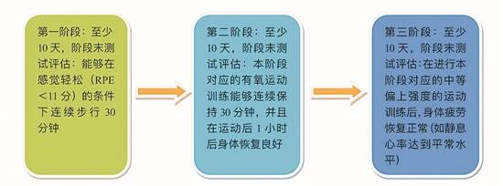 *备注:可分三个阶段恢复体力活动,以上每阶段至少保持10天,每阶段末需要做测试评估,只有达到条件才能进入下一阶段。