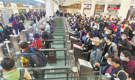 8日,大批旅客经福田口岸入境大厅快捷通道通关