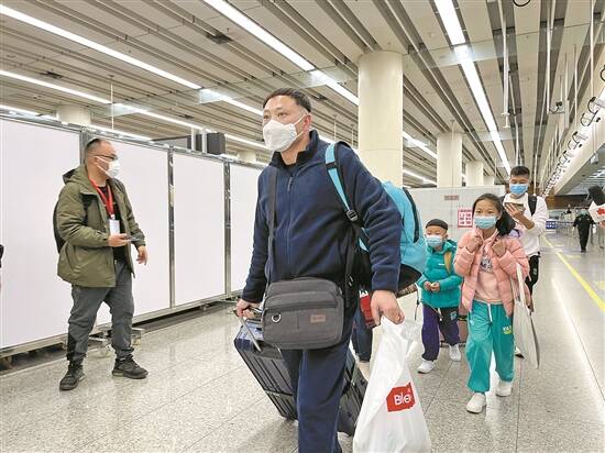 相比出境大厅,入境大厅更为火爆,当日早上7时许,福田口岸各个入境通道已排起了长队。人群中,林先生带着两个女儿一脸兴奋。“我们一家住在香港沙田,妻子两年前回内地照顾父亲,一家人从此分开。今天可以和爱人见面,孩子们也可以见到妈妈了,特别高兴。”林先生说,他们已买了当日10时深圳飞甘肃兰州的机票,今年一家人将在兰州过年。