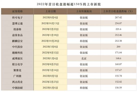 另外,在新股市场化发行的大背景下,新股中签收益也较此前年份有明显降低,以往动辄赚10万元的“肉签”未再出现,新股一二级市场的联动更为紧密。不过,打新总体仍能获得正收益,部分新股收益率仍颇为惊人。数据显示,在2022年上市的新股中,截至2022年12月29日收盘,有26只新股上市首日涨幅超过100%,其中快可电子、慧博云通、纽泰格、益客食品、麒麟信安、中汽股份等6只新股上市首日涨幅甚至在200%以上。