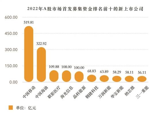 从单家公司募资规模来看,中国移动有限公司、中国海洋石油有限公司两家中国企业筹资额进入全球前十。其中,中国移动募资规模超过500亿元,成为2022年A股市场“募资王”;中国海油募资也超过300亿元,位居A股第二。