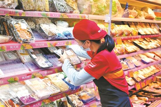 钱大妈门店工作人员正在上架生鲜食材