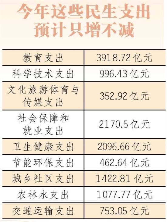 根据报告,2023年全省预计教育支出3918.72亿元,增长1.2%;科学技术支出 996.43亿元,增长1.2%;文化旅游体育与传媒支出352.92亿元,增长0.8%;社会保障和就业支出2170.5亿元,增长1%;卫生健康支出2096.66亿元,增长1%;节能环保支出462.64亿元,增长1.1%;城乡社区支出1422.81亿元,增长1%;农林水支出1077.77亿元,增长1.1%;交通运输支出753.05亿元,增长1%。