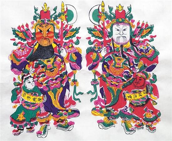 据说年画始于门神画,早在汉代时期就出现了,发展于唐宋,盛于明清。“门神门神骑红马,贴在门上守住家。门神门神扛大刀,大鬼小鬼进不来……”几千年来,从宫廷到民间,门神一直是华夏民族最喜爱的艺术形象之一,是一种不可或缺的精神寄托,也是最经典的年画主角之一。