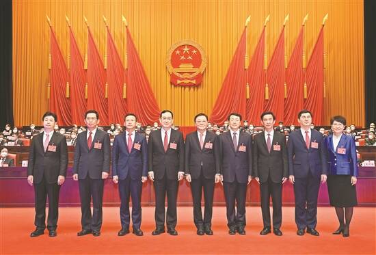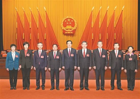 省十四届人大常委会领导班子合影。左起分别是许红、刘雅红、张硕辅、叶贞琴、黄楚平、黄宁生、吕业升、肖亚非、谭玲 南方日报记者 王辉 肖雄 石磊 万稳龙 摄
