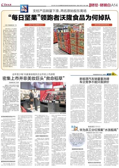 春节临近,作为零食领域的热门选项,各种品牌、类型的坚果零食花式营销,力争加入市民置办年货时的购物车。而除了在超市卖场激烈竞争,各大坚果品牌也争相布局资本市场。在洽洽食品、良品铺子等先后上市后,作为“每日坚果”产品的领跑者,青岛沃隆食品股份有限公司日前也更新招股书,并递交上会稿,拟冲刺上交所IPO。招股书显示,沃隆食品公开发行新股数量不超过2500万股,预计募资7亿元。