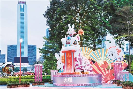 天环广场醒狮瑞兔造型祥和喜庆,展现岭南文化特色