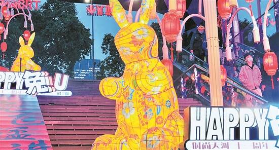 无独有偶,在距离不远的时尚天河,偌大的兔子造型也伫立在地下商场入口处,火红的灯笼更是增添了节日喜庆。