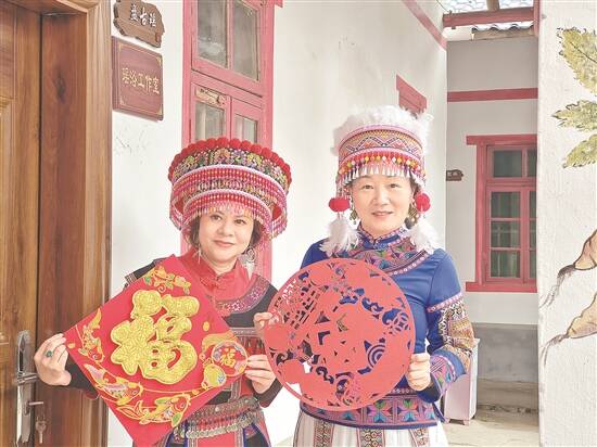邓梅英(左)和友人穿上民族服饰,喜迎新春