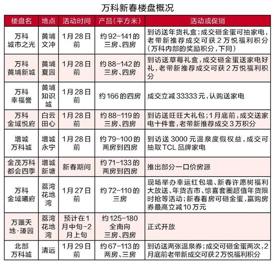 新春期间,万科在广州、清远有九个项目在售,分布在黄埔、白云、增城、荔湾和清远等各地,产品多元,从单价8000到五六万的产品都有,覆盖刚需、刚改等不同产品,优惠也非常多元,最高优惠可达10万元。 (文/梁栋贤)