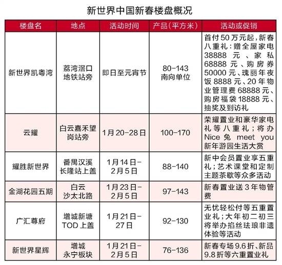 新春期间,新世界中国旗下多个项目不打烊。多个项目定位不同,从刚需产品至高端改善型产品的供应都比较充足,现场除了有各自定制版的活动外,更将推出五重或八重的叠加购房优惠。例如,荔湾区的新世界凯粤湾,算上赠送的家电家私、购房券、年夜饭和管理费等,买家福利价值将近有20万。