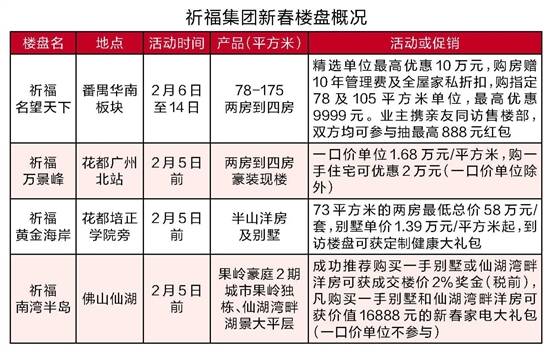 春节期间,祈福集团多盘推出购房优惠,本次推出的产品涵盖高层大单位、刚需上车盘和独栋别墅,全部为现楼,即买即住,现场还有丰富的活动。即日起到2月5日,到该公司旗下楼盘购房者购洋房赠现金利是888元,购别墅赠现金利是1888元,祈福集团业主推介新业主购买洋房,旧业主享楼价1%的奖金(税前),新业主获赠1年物业管理费,不同楼盘还有不同优惠。(文/梁栋贤)