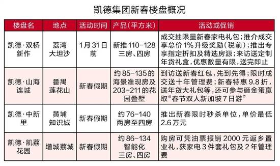 新春期间,凯德集团在广州荔湾、番禺、黄埔、增城的四个楼盘推出多重礼,到访和成交皆有优惠,有买有送有抽奖。 (文/梁栋贤)