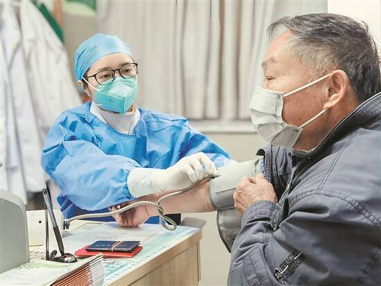 换上白大褂和蓝色防护外衣,戴上医用帽、N95口罩,洗手消毒、戴上医用手套,汤玉平打开了电脑。此时,门外已有5名患者坐在长凳上等候。65岁的村民王群英走进来,坐在汤玉平面前。仔细问询、量血压后,汤玉平得知这位大姐没有感冒、发烧,于是像往常一样,给对方开了高血压相关药品。