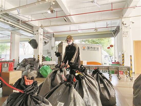 1月22日下午4点,记者在顺丰速运中环营业点看到,一辆2米宽5米长的快递配送货车缓缓倒车。这是当天的第二趟货车,快递员赖金练戴上手套,启动传送带,和其他6位快递小哥一起站在货车门口,准备把里面的货物一一分拣。